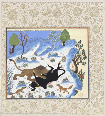 The bull is murdered unjustly, rendering of an earlier painting From 1429 Persian manuscript, KALILAH WA-DIMNAH, Harat School
